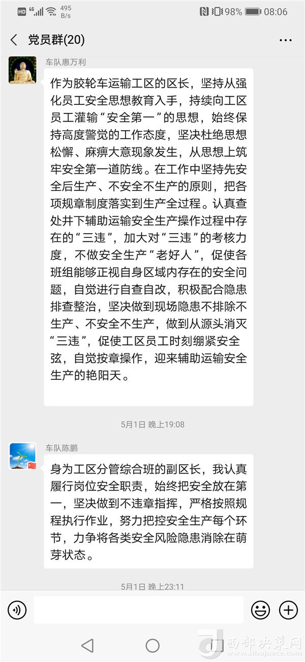 西部決策網(wǎng)訊(記者王瑞鵬 通訊員 張亞濤)為更好地發(fā)揮基層黨支部戰(zhàn)斗堡壘作用、廣大黨員先鋒模范作用,5月份,陜北礦業(yè)檸條塔公司膠輪車運輸工區(qū)開展“講安全、抓安全”主題黨日活動。該支部按照“全員學(xué)習(xí)、座談討論、結(jié)合崗位實際”的學(xué)習(xí)方式,全面深入開展“吸取教訓(xùn)、查擺問題、整改落實、確保安全”主題黨日活動。