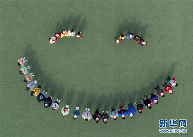 5月8日,江蘇省泰州市大馮中心小學(xué)學(xué)生在操場上拼出笑臉圖案(無人機(jī)照片)。 當(dāng)日是世界微笑日。 新華社發(fā)(湯德宏 攝)