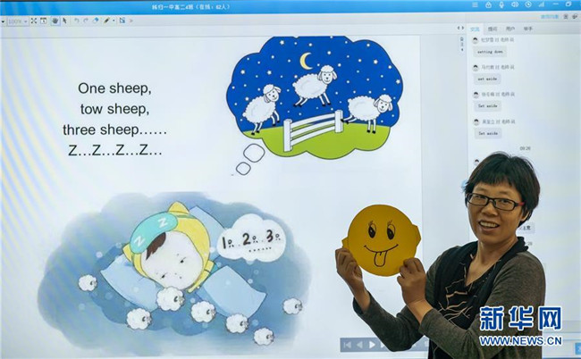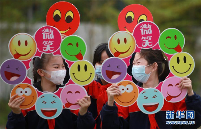 5月8日,在湖北省宜昌市秭歸縣第一中學(xué),老師在上網(wǎng)課前手拿自制的笑臉卡與學(xué)生互動(dòng)。 當(dāng)日是世界微笑日。 新華社發(fā)(向紅梅 攝)