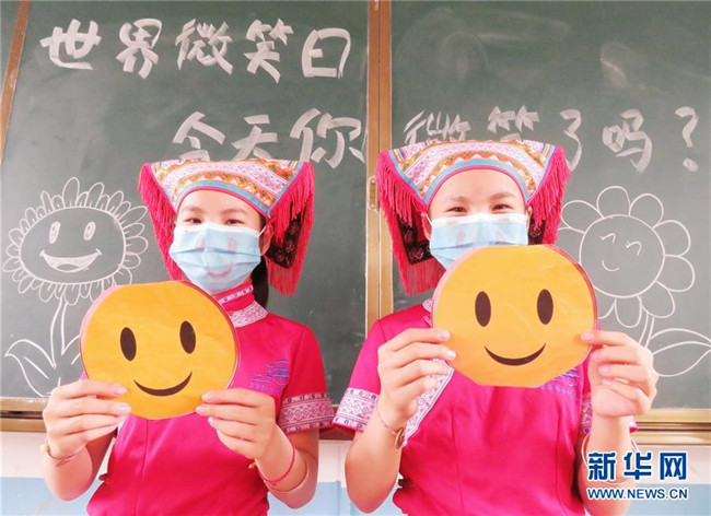 5月8日,在湖南省江永縣蘭溪瑤族鄉(xiāng)學(xué)校六年級一班,一對雙胞胎姐妹在展示自制的笑臉卡。 當(dāng)日是世界微笑日。 新華社發(fā)(田如瑞 攝)