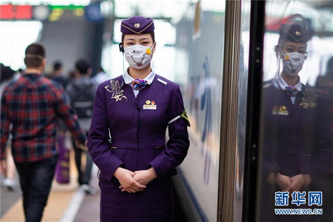 5月8日,在南京火車站站臺上,一名列車員戴著“笑臉口罩”迎接旅客上車。 當(dāng)日是世界微笑日。 新華社發(fā)(蘇陽 攝)