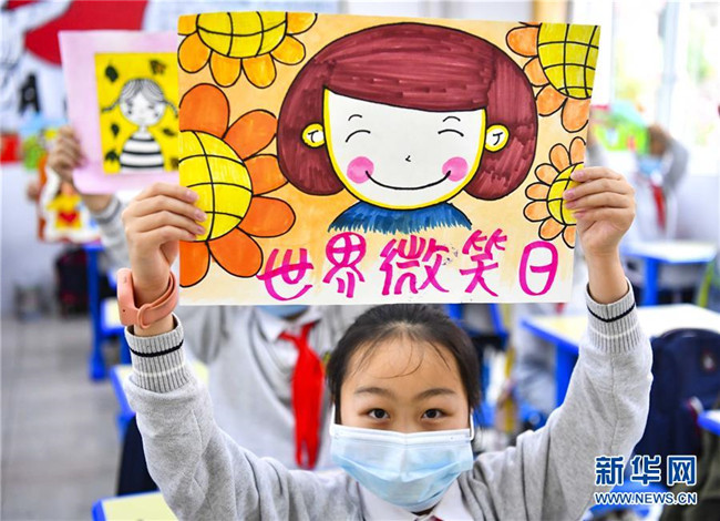 5月8日,江蘇省揚(yáng)州市竹西小學(xué)的學(xué)生們手持笑臉卡片參加活動(dòng)。 當(dāng)日是世界微笑日。 新華社發(fā)(孟德龍 攝)