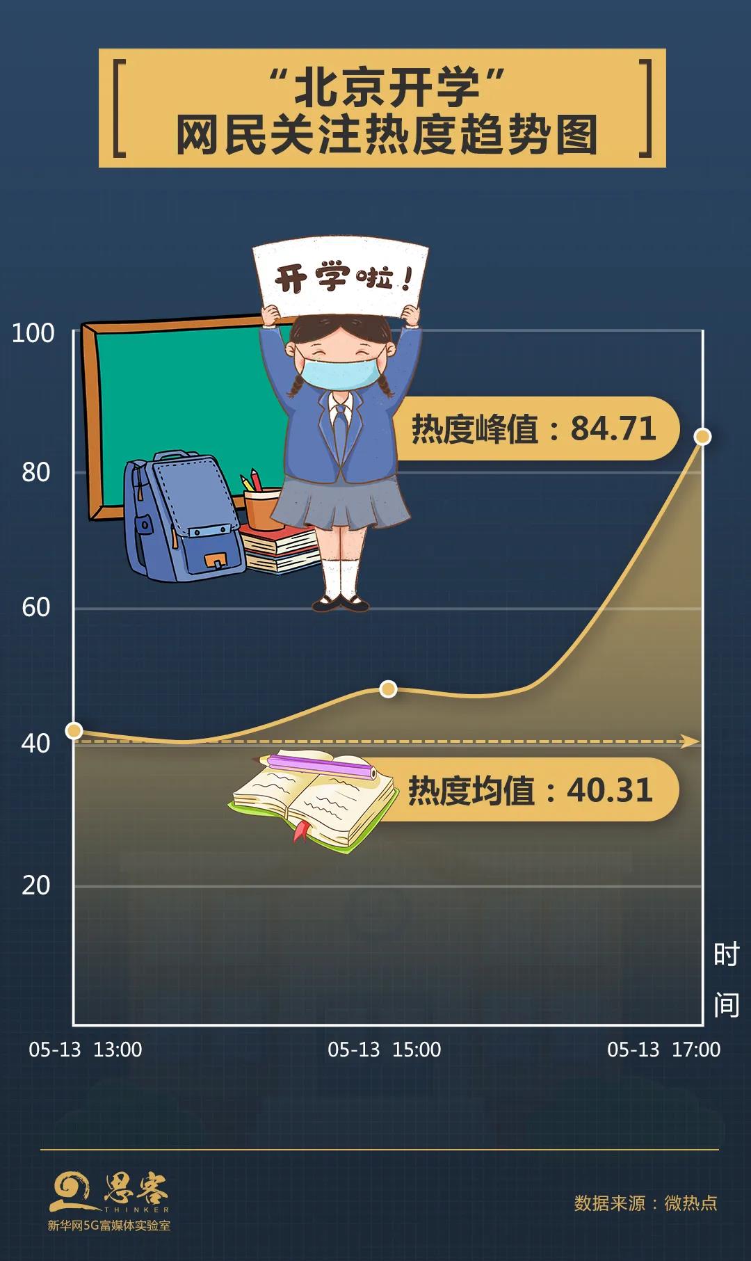 數(shù)據(jù)顯示,消息公布后,“北京開學(xué)”話題的熱度指數(shù)迅速飆升,13日17時(shí)熱度指數(shù)達(dá)到84.71,“小學(xué)”“復(fù)課”“北京”是網(wǎng)民提及最多的詞。在相關(guān)討論中,“開學(xué)后堅(jiān)持晨午晚檢制度”“開學(xué)后錯(cuò)峰上學(xué)”“中小學(xué)暑假不會(huì)推遲”等話題關(guān)注度較高。