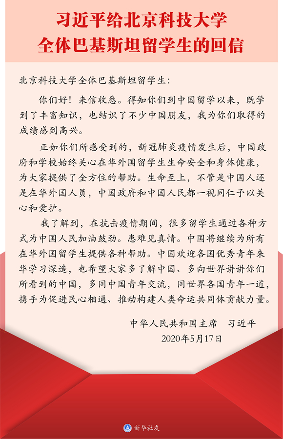 圖表:習(xí)近平給北京科技大學(xué)全體巴基斯坦留學(xué)生的回信 新華社發(fā)