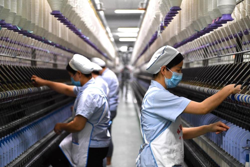 在抗擊新冠肺炎疫情過程中,陜西省咸陽紡織集團有限公司一分廠紡織工人堅守在復(fù)工復(fù)產(chǎn)一線,搶抓工時完成生產(chǎn)任務(wù)。(新華社記者張博文 攝)