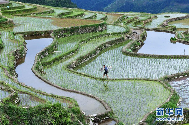 5月26日,貴州省從江縣加榜鄉(xiāng)加車(chē)村的村民在梯田上播撒種螺。