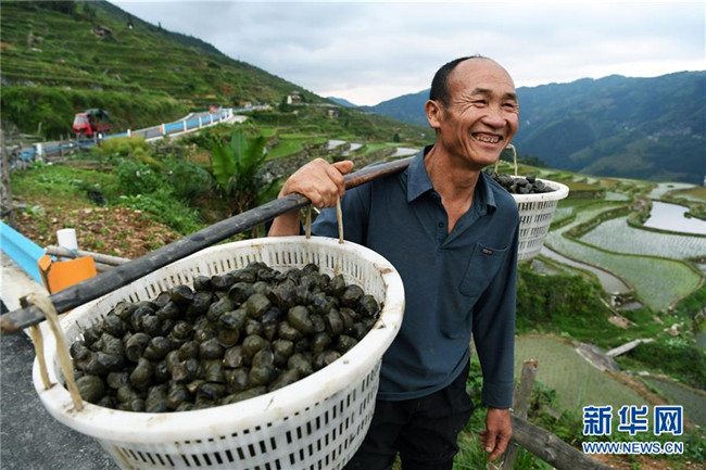 5月26日,貴州省從江縣加榜鄉(xiāng)加車(chē)村的村民在搬運(yùn)種螺。