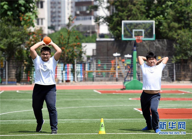 5月28日,北京市第十八中學(xué)初三年級的學(xué)生在體育課上做準(zhǔn)備活動(dòng)。新華社記者 任超 攝