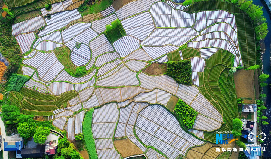 無(wú)人機(jī)視角下的重慶市酉陽(yáng)龍?zhí)舵?zhèn)柏香村示范農(nóng)田。新華網(wǎng)發(fā)(陳碧生 攝)