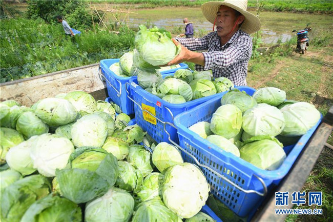 6月4日,在湘潭市雨湖區(qū)鶴嶺鎮(zhèn)龍安村,湘潭市仙女蔬菜產銷專業(yè)合作社的農戶在田里采摘包菜。 新華社記者 陳澤國 攝