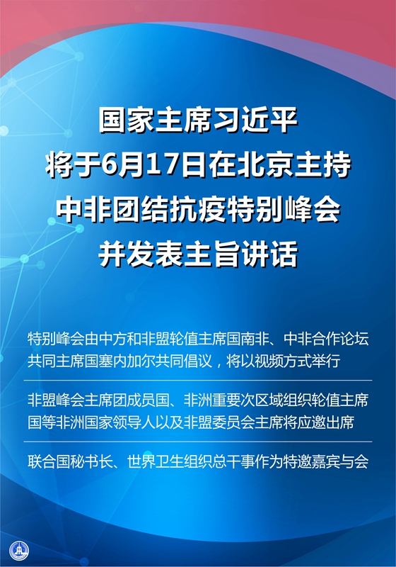 特別峰會由中方和非盟輪值主席國南非、中非合作論壇共同主席國塞內(nèi)加爾共同倡議,將以視頻方式舉行。非盟峰會主席團成員國、非洲重要次區(qū)域組織輪值主席國等非洲國家領(lǐng)導人以及非盟委員會主席將應邀出席。聯(lián)合國秘書長、世界衛(wèi)生組織總干事作為特邀嘉賓與會。