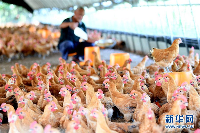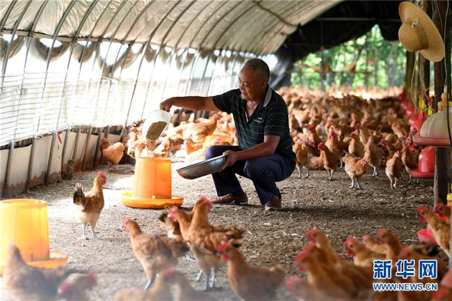 6月26日,在肥西縣花崗鎮(zhèn)楊灣村的土雞養(yǎng)殖基地里,黃榮春在添加飼料。新華社記者 劉軍喜 攝
