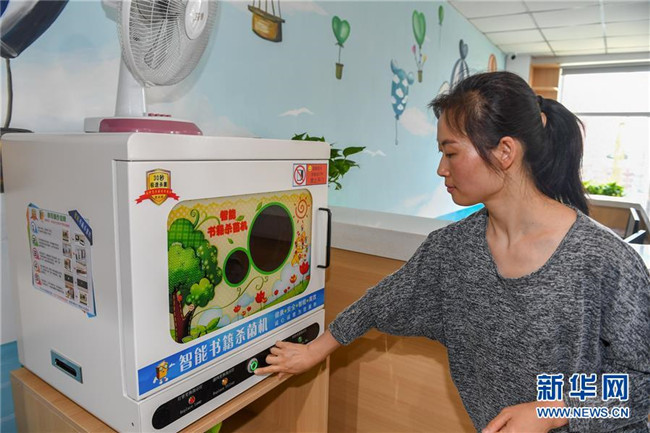 7月2日,在長春市少年兒童圖書館平陽社區(qū)繪本主題分館,管理員金敏為圖書進行消殺。 新華社記者 張楠 攝