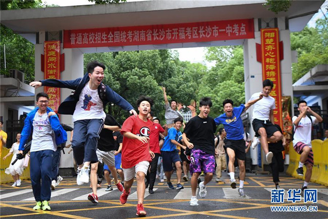 7月8日,考生們?cè)诟呖冀Y(jié)束后跑出湖南省長(zhǎng)沙市一中考點(diǎn)。 當(dāng)日,全國(guó)部分地區(qū)2020年高考結(jié)束。 新華社記者 薛宇舸 攝