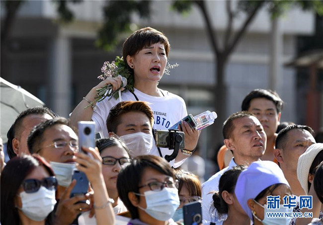 7月8日,考生拿著鮮花向湖南省長(zhǎng)沙市一中考點(diǎn)外等候的家長(zhǎng)示意。 當(dāng)日,全國(guó)部分地區(qū)2020年高考結(jié)束。 新華社記者 薛宇舸 攝