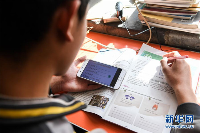 內(nèi)蒙古準格爾旗龍口鎮(zhèn)紅樹梁村的初一學生劉進才在家中上網(wǎng)課(3月10日攝)。新華社記者 劉磊 攝