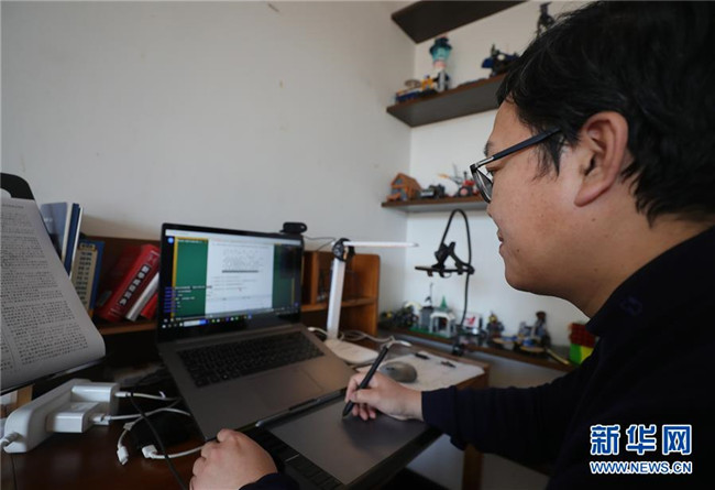 遼寧省沈陽市蘇家屯區(qū)青松中學杜波老師在家中通過網(wǎng)絡(luò)平臺給同學們上化學課(3月11日攝)。新華社記者 楊青 攝