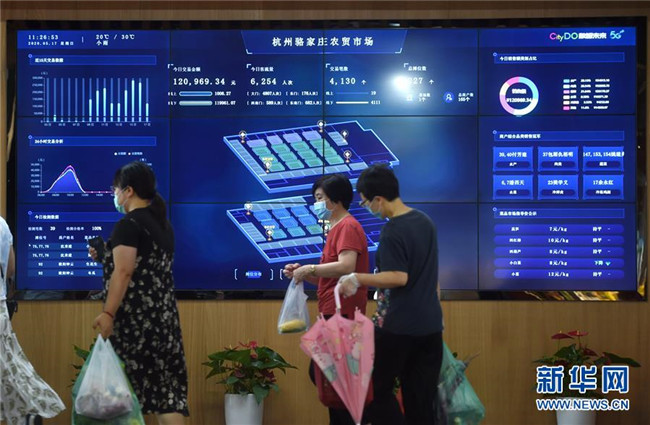 浙江省杭州市的5G農(nóng)貿(mào)市場——駱家莊農(nóng)貿(mào)市場的大屏幕上實時顯示交易、客流等相關(guān)情況(5月17日攝)。新華社記者 韓傳號 攝
