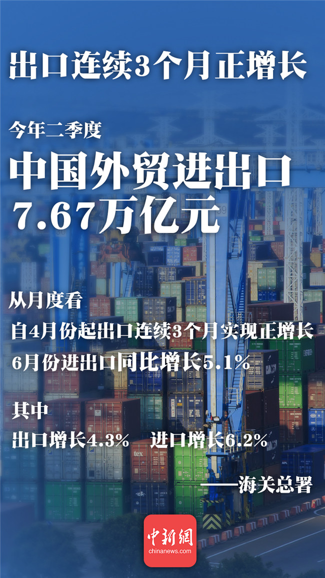 出口連續(xù)3個(gè)月正增長。海關(guān)總署數(shù)據(jù)顯示,上半年外貿(mào)進(jìn)出口整體表現(xiàn)好于預(yù)期。6月份當(dāng)月進(jìn)出口實(shí)現(xiàn)年內(nèi)首次雙雙正增長。出口自4月份起連續(xù)三個(gè)月保持同比正增長。