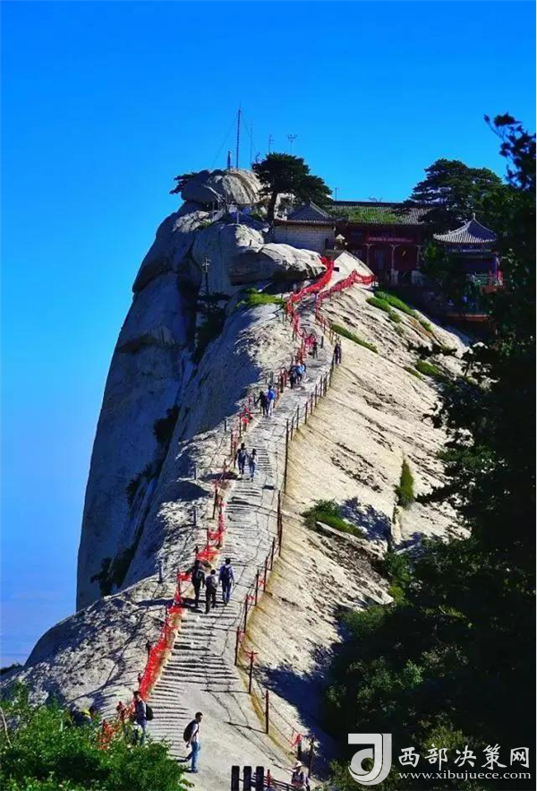 華山由五峰組成,其中東西南三峰呈鼎形相依,是為主峰,中峰和北峰相輔,而且還有七十多座小峰環(huán)衛(wèi)而立,宛如層層花瓣。五峰中最高者是南峰,最低者是北峰。五峰鼎峙聳立,高插云霄,形如刀削,登臨絕頂,頓覺(jué)“只有天在上,更無(wú)山與齊”之感。