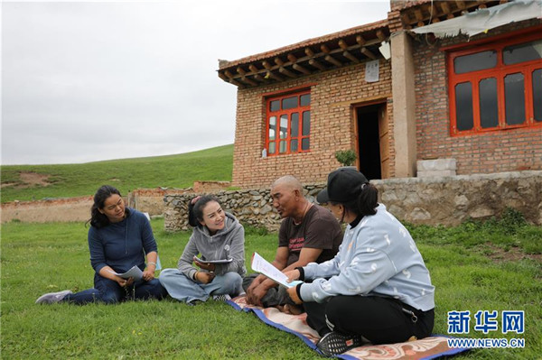7月23日,在甘肅省甘南藏族自治州夏河縣??奇?zhèn)崗岔村,卓瑪吉(左二)和駐村幫扶工作隊隊員一起入戶了解村民巴桑一家的生產(chǎn)生活情況。崗岔村是甘肅省甘南藏族自治州夏河縣??奇?zhèn)的一個牧業(yè)村,平均海拔3000米以上。2018年,在夏河縣文明辦工作的卓瑪吉開始擔任駐村幫扶工作隊隊長,每年都有200多天待在草原上。兩年來,卓瑪吉帶領大家開辦扶貧車間,發(fā)展特色產(chǎn)業(yè),聯(lián)系勞務輸出。為了讓村民更全面地了解精準扶貧政策,卓瑪吉登門宣講政策。為了提高村容村貌,卓瑪吉發(fā)動大家開展廁所革命和庭院環(huán)境評比,積極響應甘南藏族自治州“全域無垃圾”創(chuàng)建行動。她還從縣城請來醫(yī)生,為村民舉辦健康講座,在全村婦女中開展“兩癌篩查”。如今,崗岔村變成了干凈、整齊、富裕、美麗的生態(tài)文明村,提前實現(xiàn)了整村脫貧。談起心愿,卓瑪吉說:“要讓草原和草原上的人都變得更美。”新華社發(fā)(杜哲宇攝)