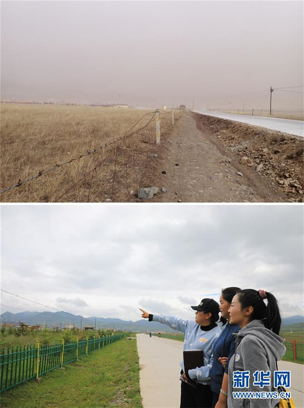 拼版照片:上圖為崗岔村村道綠化改造前的面貌(資料照片)。下圖為7月23日,卓瑪吉(右一)和駐村幫扶工作隊隊員站在綠化改造后的崗岔村村道上,謀劃下一步的工作。新華社發(fā)(杜哲宇攝)崗岔村是甘肅省甘南藏族自治州夏河縣桑科鎮(zhèn)的一個牧業(yè)村,平均海拔3000米以上。2018年,在夏河縣文明辦工作的卓瑪吉開始擔任駐村幫扶工作隊隊長,每年都有200多天待在草原上。兩年來,卓瑪吉帶領大家開辦扶貧車間,發(fā)展特色產(chǎn)業(yè),聯(lián)系勞務輸出。為了讓村民更全面地了解精準扶貧政策,卓瑪吉登門宣講政策。為了提高村容村貌,卓瑪吉發(fā)動大家開展廁所革命和庭院環(huán)境評比,積極響應甘南藏族自治州“全域無垃圾”創(chuàng)建行動。她還從縣城請來醫(yī)生,為村民舉辦健康講座,在全村婦女中開展“兩癌篩查”。如今,崗岔村變成了干凈、整齊、富裕、美麗的生態(tài)文明村,提前實現(xiàn)了整村脫貧。談起心愿,卓瑪吉說:“要讓草原和草原上的人都變得更美。”新華社發(fā)