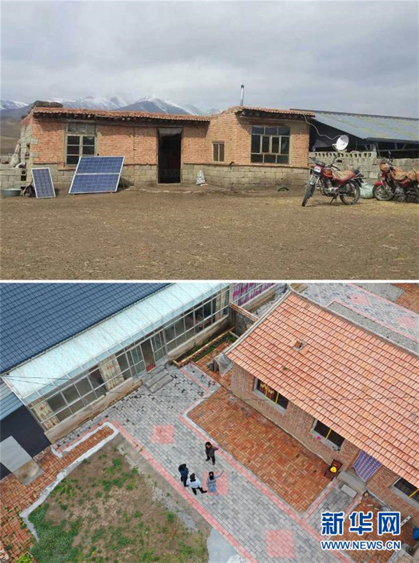 拼版照片:上圖為崗岔村村民才讓扎西在易地扶貧搬遷之前居住的房子(資料照片)。下圖為才讓扎西易地扶貧搬遷后的新家(7月23日攝,無人機照片)。新華社發(fā)(杜哲宇攝)崗岔村是甘肅省甘南藏族自治州夏河縣??奇?zhèn)的一個牧業(yè)村,平均海拔3000米以上。2018年,在夏河縣文明辦工作的卓瑪吉開始擔任駐村幫扶工作隊隊長,每年都有200多天待在草原上。兩年來,卓瑪吉帶領大家開辦扶貧車間,發(fā)展特色產(chǎn)業(yè),聯(lián)系勞務輸出。為了讓村民更全面地了解精準扶貧政策,卓瑪吉登門宣講政策。為了提高村容村貌,卓瑪吉發(fā)動大家開展廁所革命和庭院環(huán)境評比,積極響應甘南藏族自治州“全域無垃圾”創(chuàng)建行動。她還從縣城請來醫(yī)生,為村民舉辦健康講座,在全村婦女中開展“兩癌篩查”。如今,崗岔村變成了干凈、整齊、富裕、美麗的生態(tài)文明村,提前實現(xiàn)了整村脫貧。談起心愿,卓瑪吉說:“要讓草原和草原上的人都變得更美。”新華社發(fā)