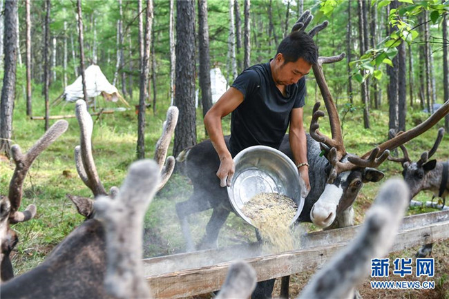 古木森在根河市烏力庫瑪林場內(nèi)的馴鹿放養(yǎng)點(diǎn)喂馴鹿(7月13日攝)。 新華社記者 貝赫 攝