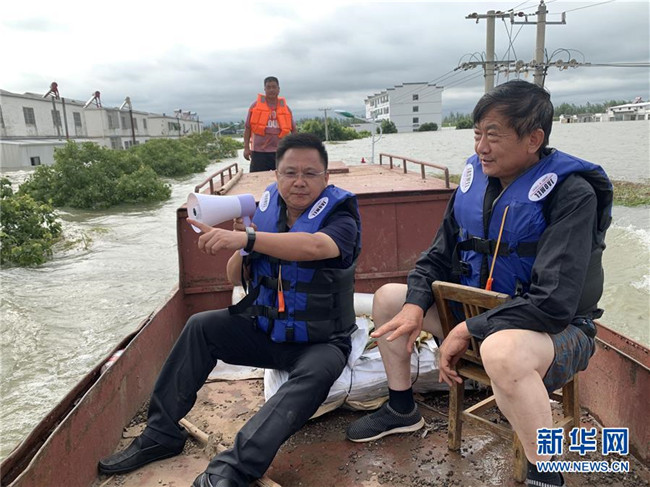 7月15日,安徽省宿松縣洲頭鄉(xiāng)黨委書(shū)記唐志華(左)在查看泗洲村受災(zāi)情況。 新華社發(fā)