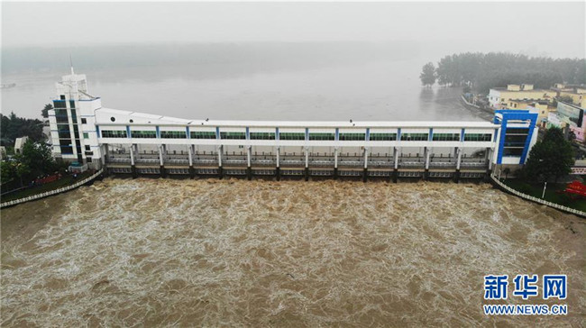 7月20日,淮河王家壩閘開(kāi)閘泄洪(無(wú)人機(jī)照片)。 新華社記者 黃博涵 攝