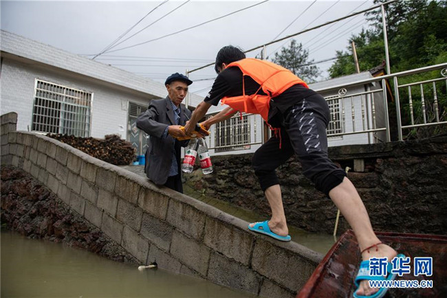 7月7日,湖南省常德市石門(mén)縣雁池鄉(xiāng)重福橋村的干部(右)為被困群眾運(yùn)送生活物資。 新華社記者 陳思汗 攝