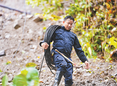 阿旺背著光纜在查找線路斷點(diǎn)。本報(bào)記者 徐馭堯攝