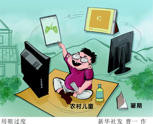 記者走訪發(fā)現(xiàn),暑期用眼過度的現(xiàn)象在不少農村兒童中存在。有孩子跟著電視臺追劇,一看就是一整天;有家長晨起上廁所,竟發(fā)現(xiàn)孩子“刷了一夜手機”;一位媽媽“吐槽”說,為了讓孩子少看電子產品,每天都要“斗智斗勇”:改密碼、藏充電線、沒收手機……