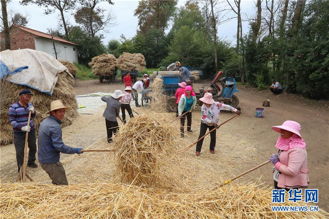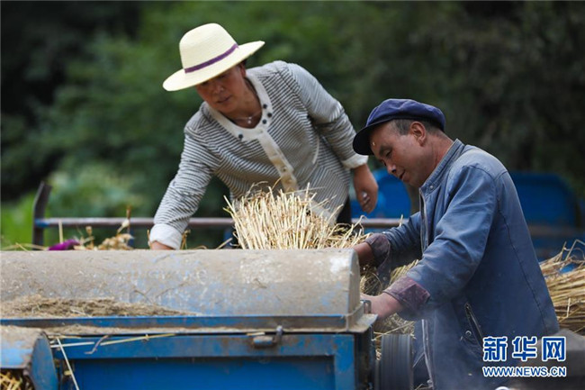 8月22日,元古堆村村民在脫麥子。 目前,在甘肅省定西市渭源縣元古堆村,村民正忙著脫麥子。當(dāng)?shù)胤N植的590多畝冬小麥近日喜獲豐收。 新華社記者 馬希平 攝