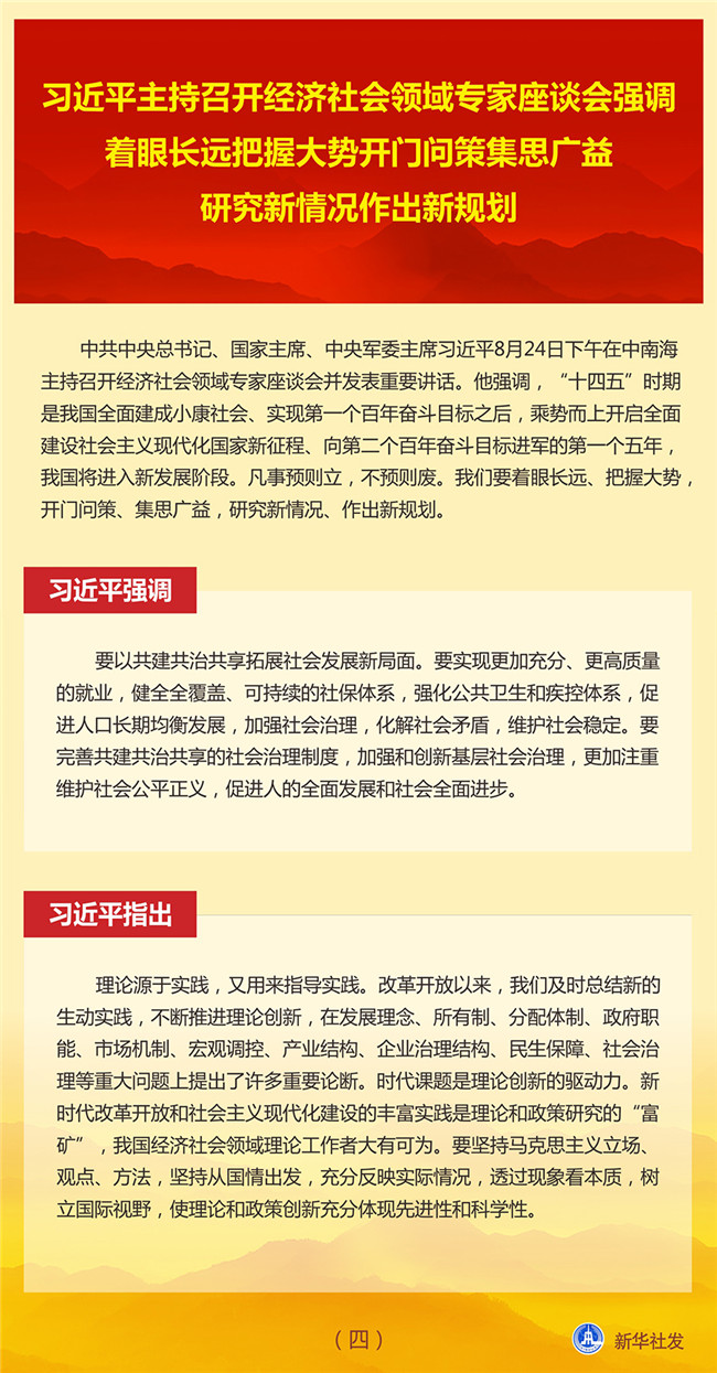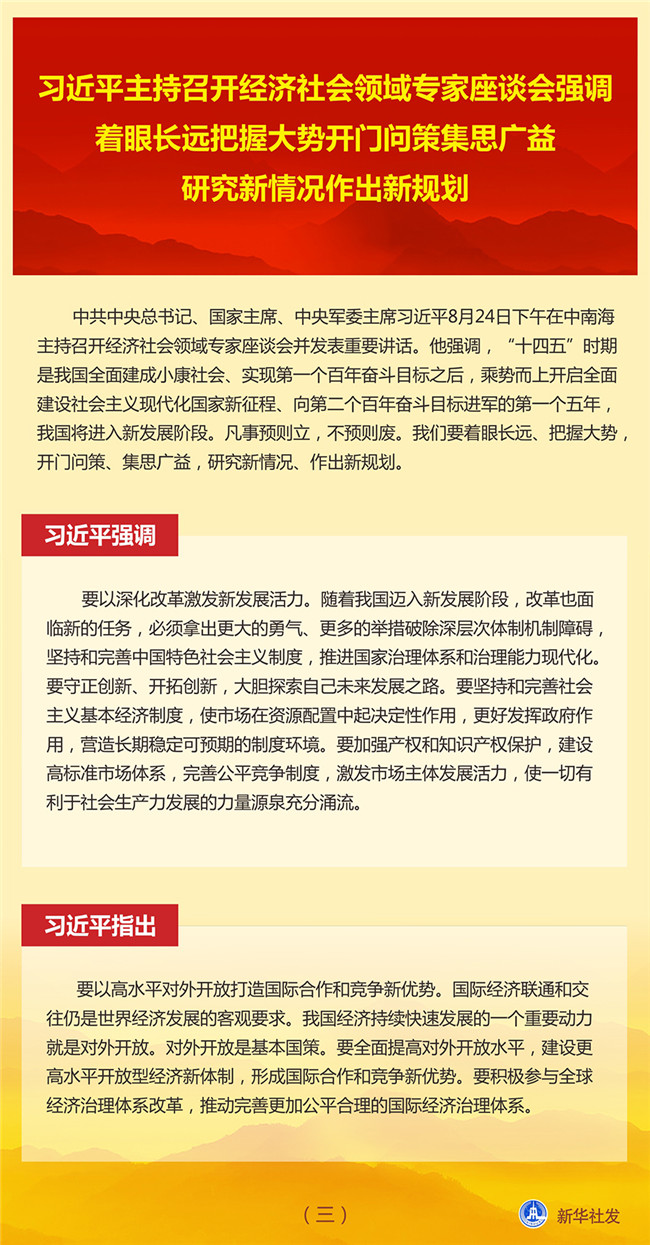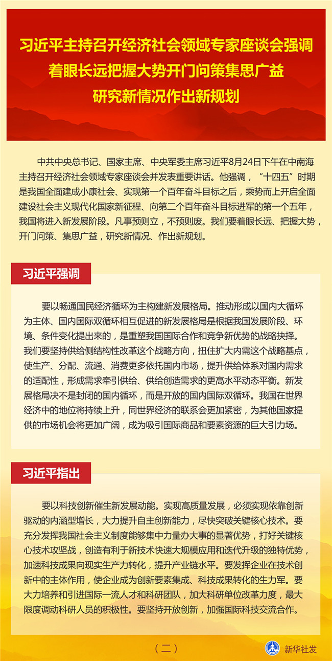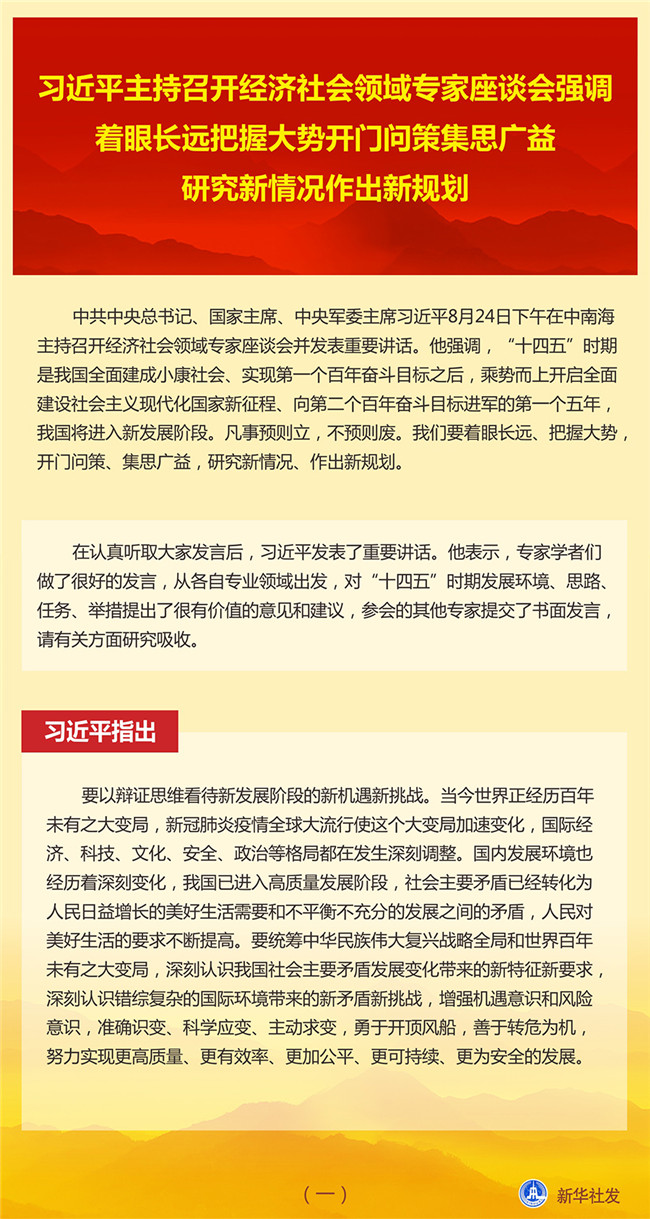 中共中央總書記、國家主席、中央軍委主席習近平8月24日下午在中南海主持召開經(jīng)濟社會領(lǐng)域?qū)<易剷l(fā)表重要講話。他強調(diào),“十四五”時期是我國全面建成小康社會、實現(xiàn)第一個百年奮斗目標之后,乘勢而上開啟全面建設(shè)社會主義現(xiàn)代化國家新征程、向第二個百年奮斗目標進軍的第一個五年,我國將進入新發(fā)展階段。凡事預(yù)則立,不預(yù)則廢。我們要著眼長遠、把握大勢,開門問策、集思廣益,研究新情況、作出新規(guī)劃。