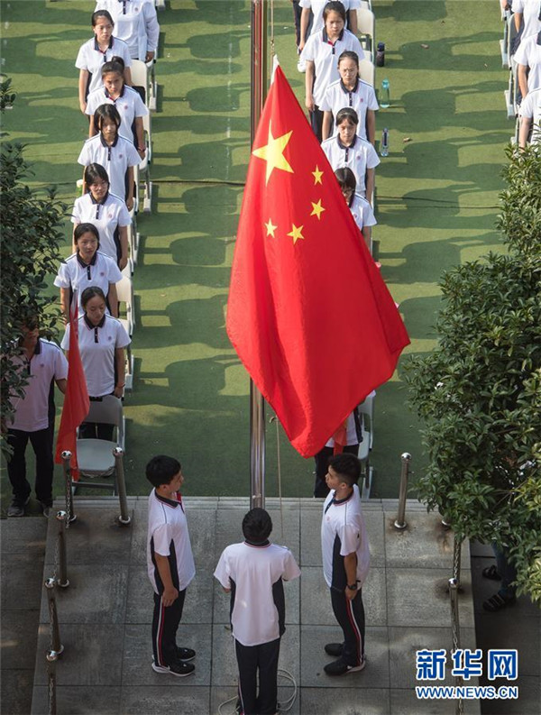 9月1日,武漢中學(xué)的開(kāi)學(xué)典禮舉行升旗儀式。當(dāng)日,武漢市2842所中小學(xué)、幼兒園迎來(lái)開(kāi)學(xué),涉及學(xué)生139.9萬(wàn)人,百萬(wàn)學(xué)子重返校園。新華社記者肖藝九攝
