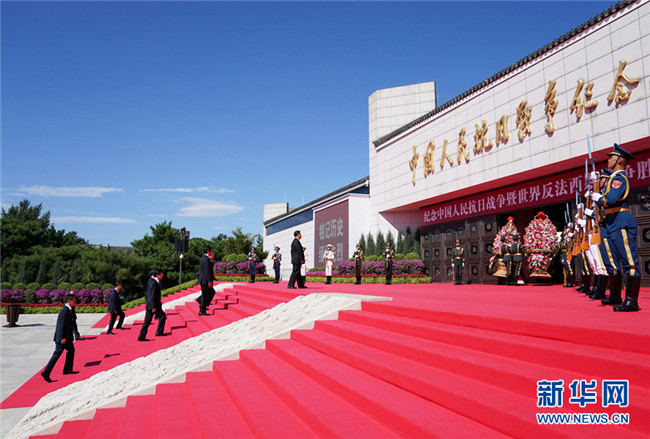 9月3日上午,習(xí)近平、李克強(qiáng)、栗戰(zhàn)書、汪洋、王滬寧、趙樂際、韓正、王岐山等黨和國家領(lǐng)導(dǎo)人來到中國人民抗日戰(zhàn)爭紀(jì)念館,出席紀(jì)念中國人民抗日戰(zhàn)爭暨世界反法西斯戰(zhàn)爭勝利75周年向抗戰(zhàn)烈士敬獻(xiàn)花籃儀式。 新華社記者 丁海濤 攝
