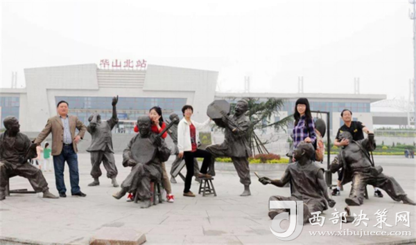 華山北站廣場上的老腔雕塑,老腔是陜西省非常古老的漢族戲曲表演形式,長期在華陰廣泛流傳,分老腔、時腔兩個劇種,表演方法和全國大致相同,先搭好臺子、撐好"亮子",然后借助燈火,以竹簽挑撥用皮革雕成的人物進行舞臺表演。流傳千年的老腔是中國首批國家級非物質遺產保護項目。
