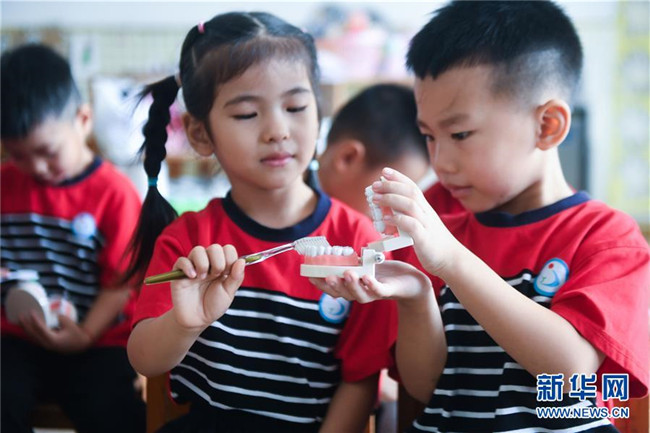 9月16日,孩子在學(xué)習(xí)正確的刷牙方式。新華社記者 徐昱 攝