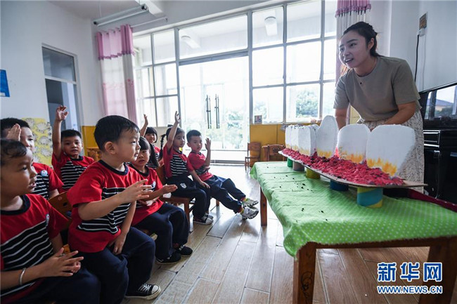 9月16日,老師利用模型給孩子講解牙齒、牙齦的結(jié)構(gòu)及正確的刷牙方式。新華社記者 徐昱 攝