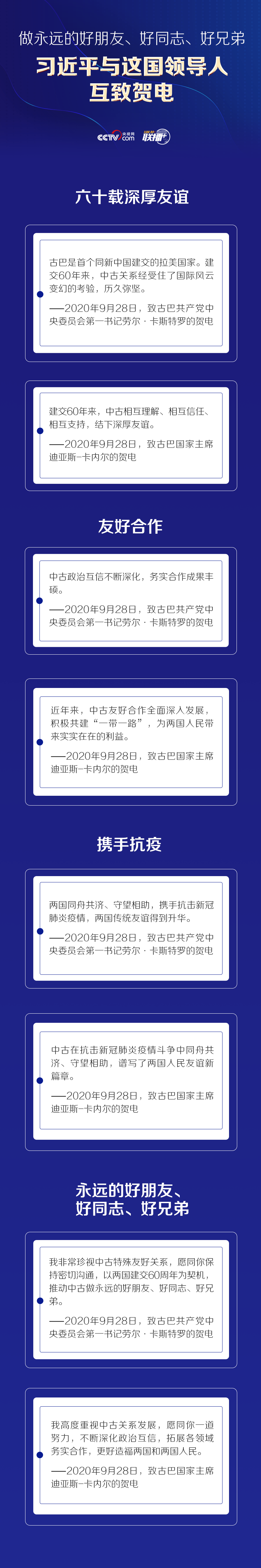 古巴是首個同新中國建交的拉美國家。建交60年來,中古關(guān)系經(jīng)受住了國際風(fēng)云變幻的考驗,歷久彌堅。在新冠肺炎疫情疊加百年未有之大變局的背景下,習(xí)近平主席與古巴共產(chǎn)黨中央委員會第一書記勞爾·卡斯特羅、古巴國家主席迪亞斯-卡內(nèi)爾互致賀電,共話中古友誼,央視網(wǎng)《聯(lián)播+》特為您梳理。