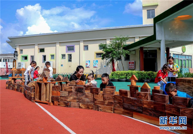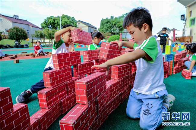 9月28日,孩子們在搭建“萬里長城”。新華社記者 徐昱 攝