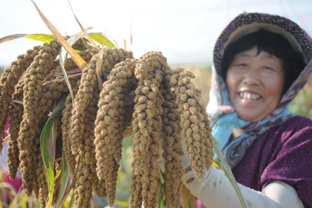9月22日,山東省煙臺(tái)市福山區(qū)老官莊村農(nóng)民展示剛剛收獲的無公害谷子。新華社發(fā)(申吉忠 攝)