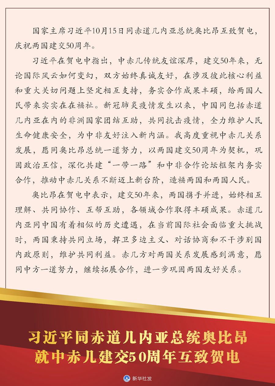 習(xí)近平在賀電中指出,中赤幾傳統(tǒng)友誼深厚,建交50年來(lái),無(wú)論國(guó)際風(fēng)云如何變幻,雙方始終真誠(chéng)友好,在涉及彼此核心利益和重大關(guān)切問(wèn)題上堅(jiān)定相互支持,務(wù)實(shí)合作成果豐碩,給兩國(guó)人民帶來(lái)實(shí)實(shí)在在福祉。新冠肺炎疫情發(fā)生以來(lái),中國(guó)同包括赤道幾內(nèi)亞在內(nèi)的非洲國(guó)家團(tuán)結(jié)互助,共同抗擊疫情,全力維護(hù)人民生命健康安全,為中非友好注入新內(nèi)涵。我高度重視中赤幾關(guān)系發(fā)展,愿同奧比昂總統(tǒng)一道努力,以?xún)蓢?guó)建交50周年為契機(jī),鞏固政治互信,深化共建“一帶一路”和中非合作論壇框架內(nèi)務(wù)實(shí)合作,推動(dòng)中赤幾關(guān)系不斷邁上新臺(tái)階,造福兩國(guó)和兩國(guó)人民。