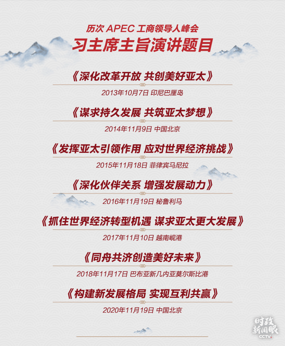 APEC工商領(lǐng)導(dǎo)人峰會(huì)有一個(gè)傳統(tǒng),就是邀請(qǐng)包括中國在內(nèi)的大國領(lǐng)導(dǎo)人發(fā)表演講。2013年以來,從印尼巴厘島到巴布亞新幾內(nèi)亞莫爾斯比港,習(xí)主席曾連續(xù)六年出席APEC工商領(lǐng)導(dǎo)人峰會(huì)并發(fā)表主旨演講。今年是他第七次在這一場(chǎng)合發(fā)表演講。