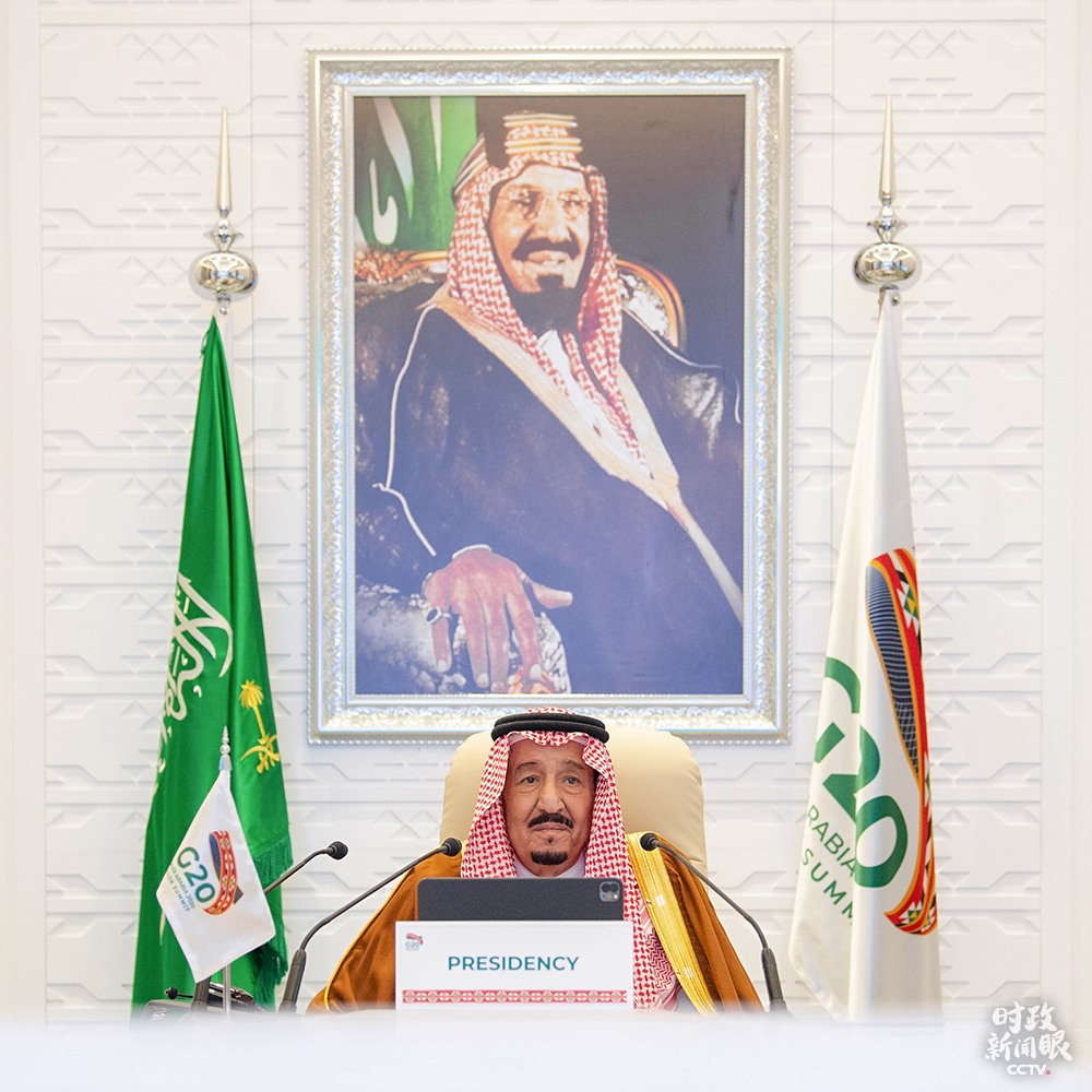 △沙特國王薩勒曼主持G20領(lǐng)導(dǎo)人第15次峰會第一階段會議。(來源于G20官方社交媒體)