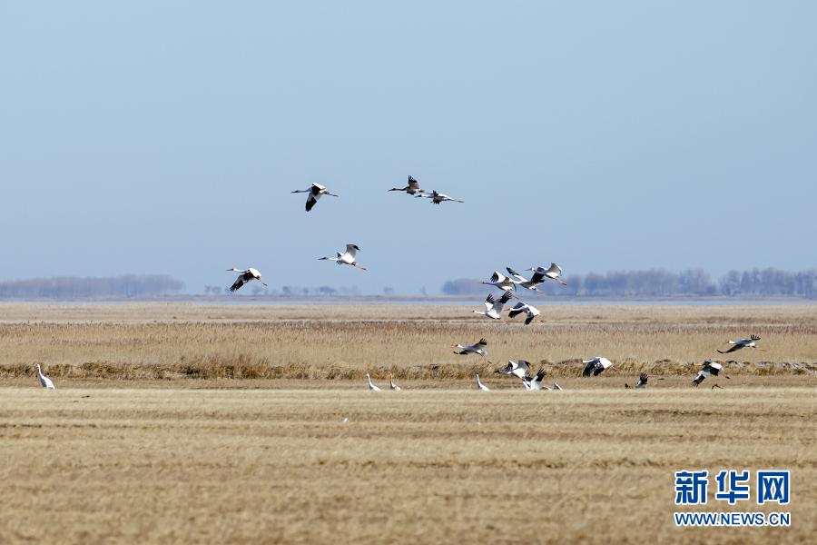在內(nèi)蒙古扎賚特旗圖牧吉國家級(jí)自然保護(hù)區(qū)拍攝的白鶴(11月6日攝)?!⌒氯A社發(fā)(畢力格 攝)