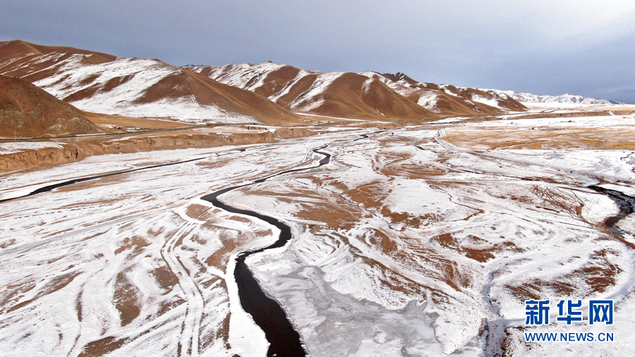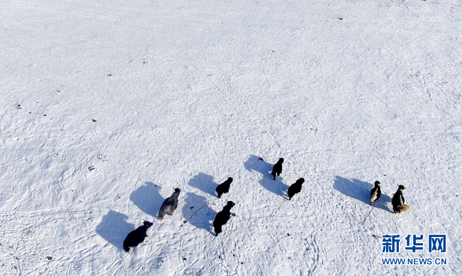 12月6日,牦牛在雪后的阿柔草原上活動(dòng)(無人機(jī)照片)。新華社記者 張宏祥 攝
