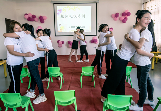 9月9日,江西省吉安市新干縣麥鎮(zhèn)中心幼兒園支教老師鄒小琳(左五)正在對該園幼教老師進(jìn)行禮儀培訓(xùn)。視覺中國供圖