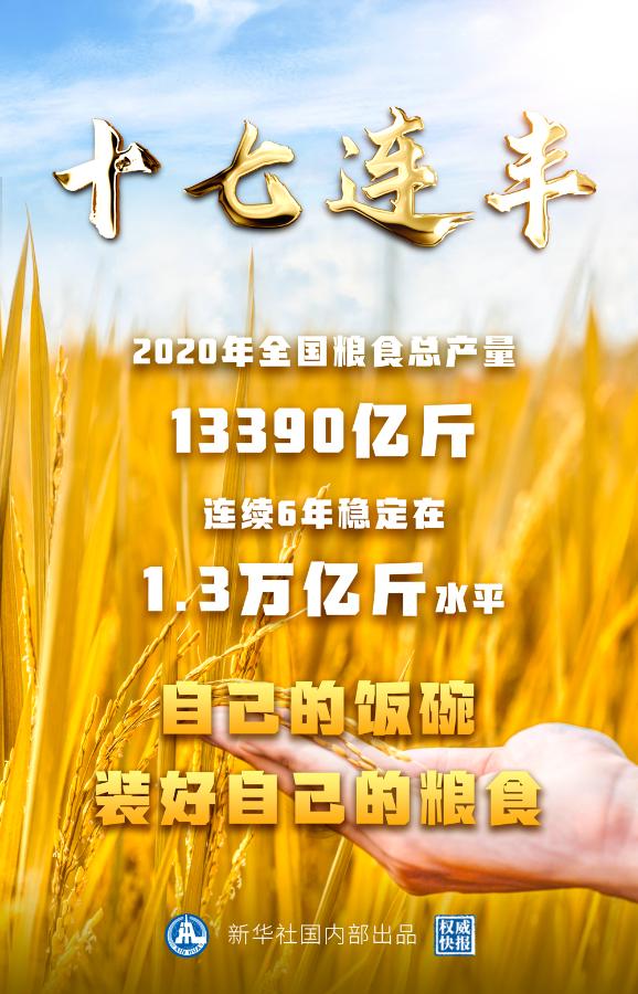 我國(guó)糧食生產(chǎn)實(shí)現(xiàn)“十七連豐”。國(guó)家統(tǒng)計(jì)局10日發(fā)布數(shù)據(jù),2020年全國(guó)糧食總產(chǎn)量為13390億斤,比上年增加113億斤,增長(zhǎng)0.9%,連續(xù)6年保持在1.3萬億斤以上。